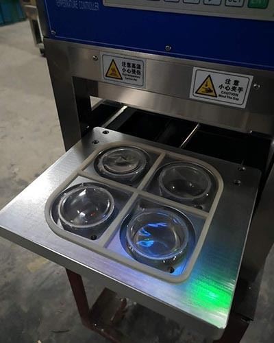 This cup sealer machine is automatic computer control with PLC dispaly panel. The customer just need to put the plastic cups into the mold and press on the open button to start.