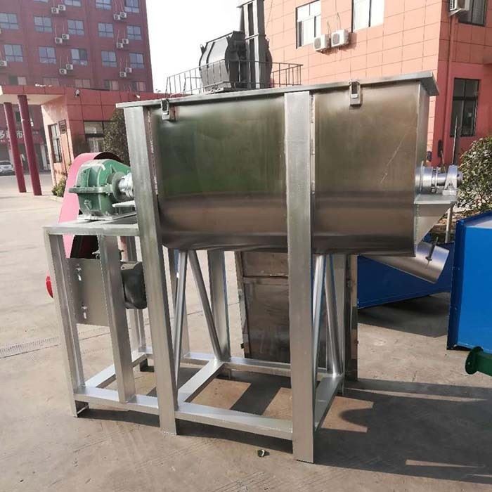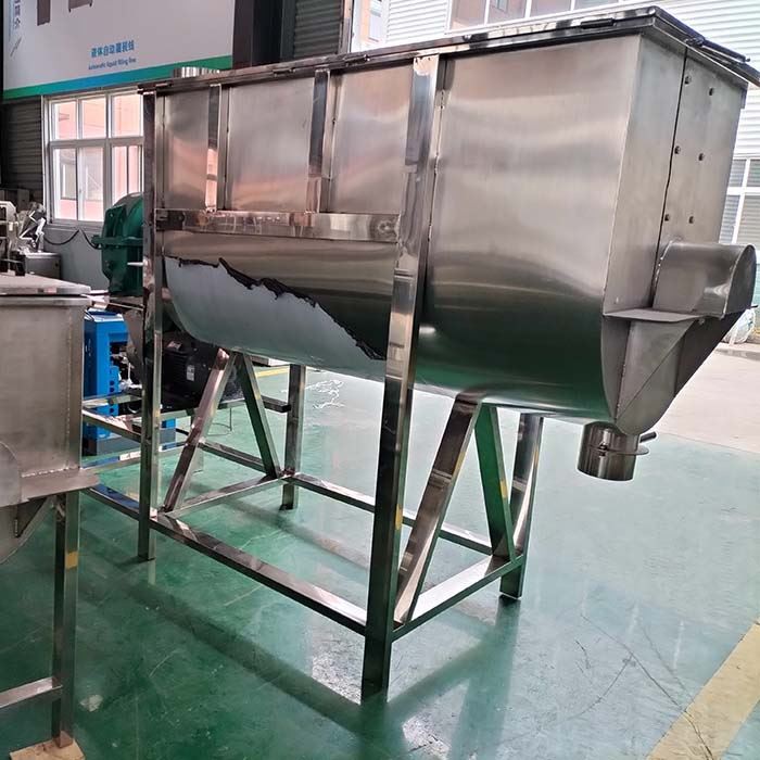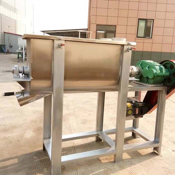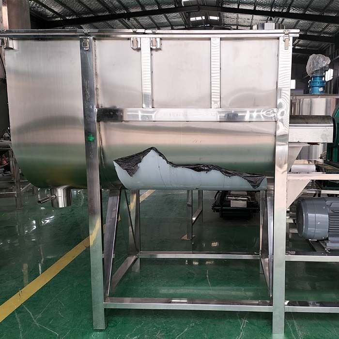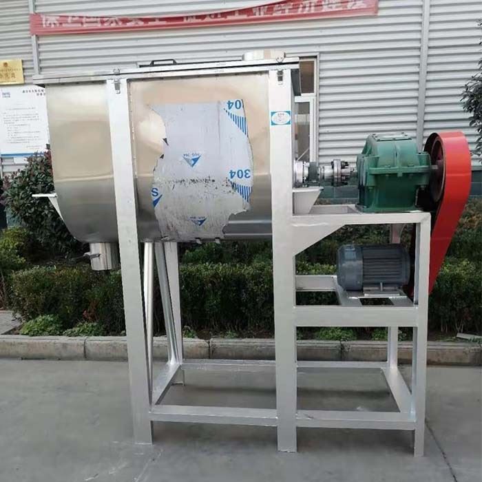 The horizontal ribbon blender mixer machine uses ribbon blender to mix powder and granules. The ribbon blender consists of two layers.When the powder material is put into the mixer, the inner belt makes the material move outward, and the outer belt makes the material move inward, forming a good cycle of the material.
